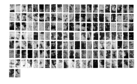 Composition de 149 monotypes de 7,5×12 cm. Chaque monotype, marqué de lignes noires et blanches horizontales, représente la carte d’identité d’une femme morte en 2019. 149 cartons contre l’oubli, pour dénoncer ces rangées de féminicides. 200cm x 140cm.